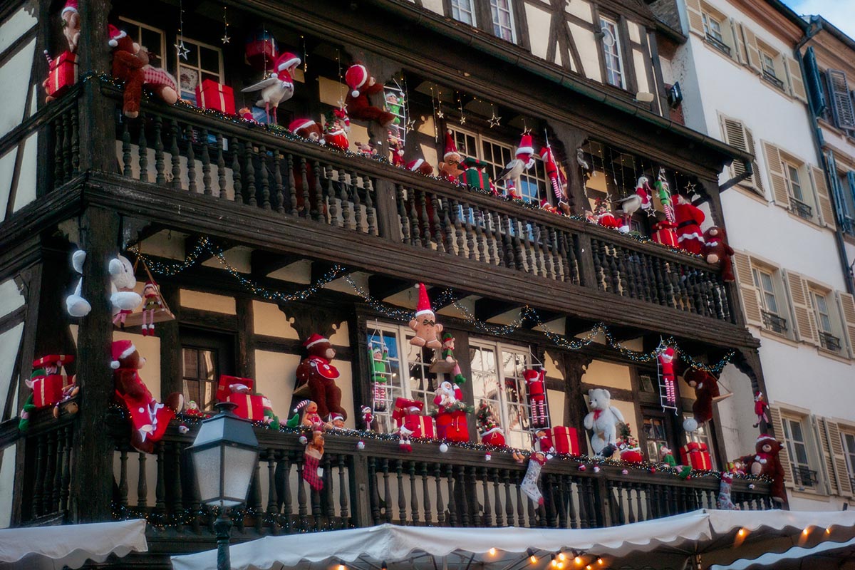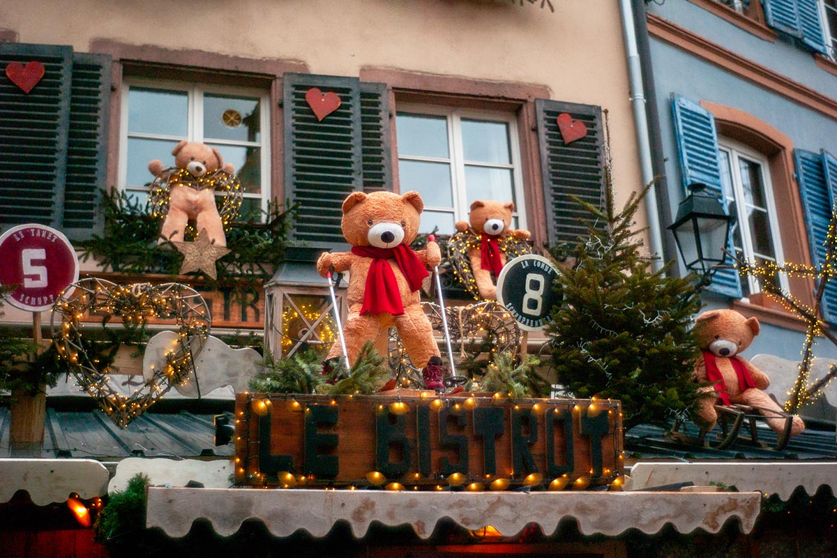 The famous teddy bear decor is located on Rue du Maroquin, right on the storefront of Le Tire Bouchon French restaurant. During winter, the restaurant transforms into one of Strasbourg’s most iconic Christmas buildings. The alleyway itself is narrow but constantly packed with visitors trying to capture photos of this unforgettable festive scene.