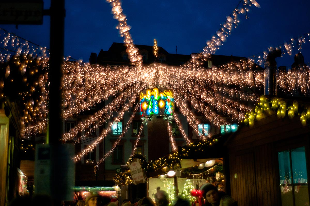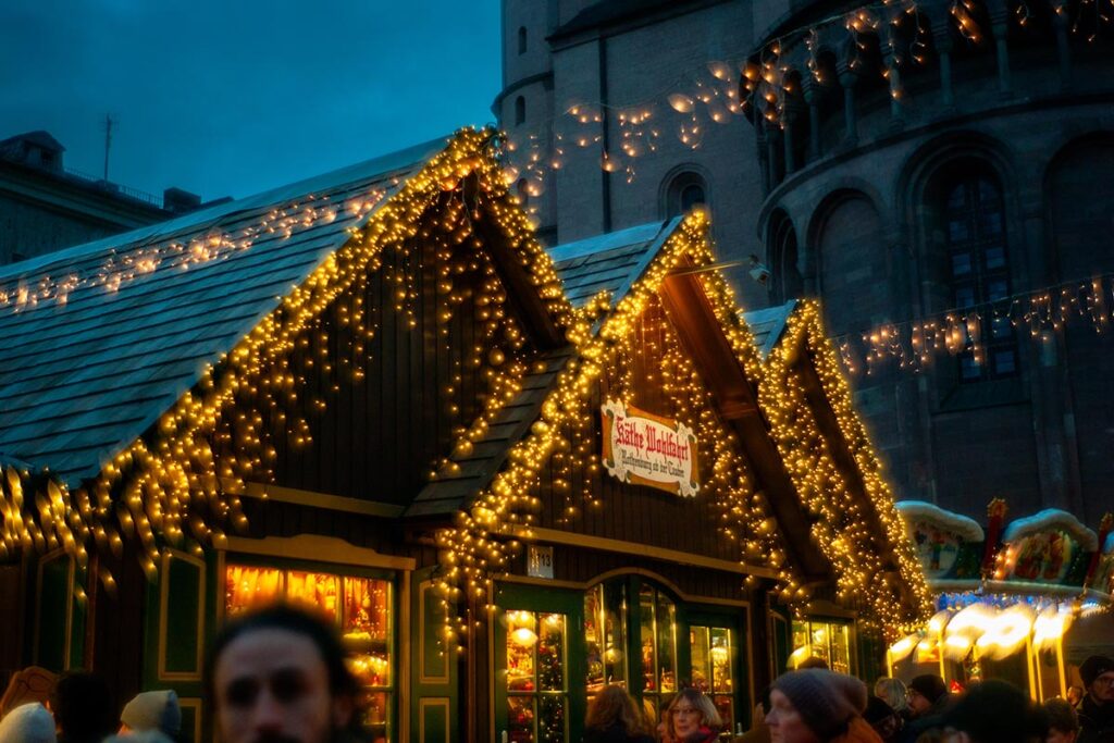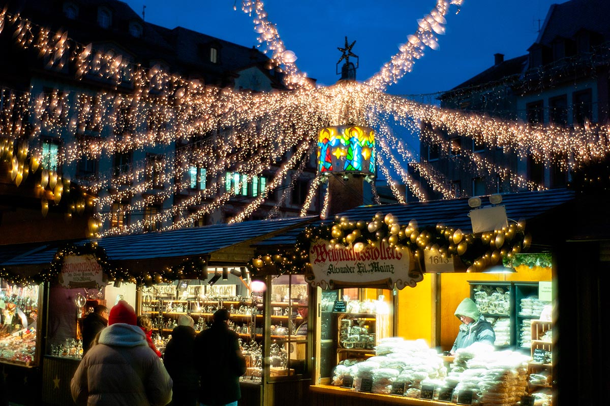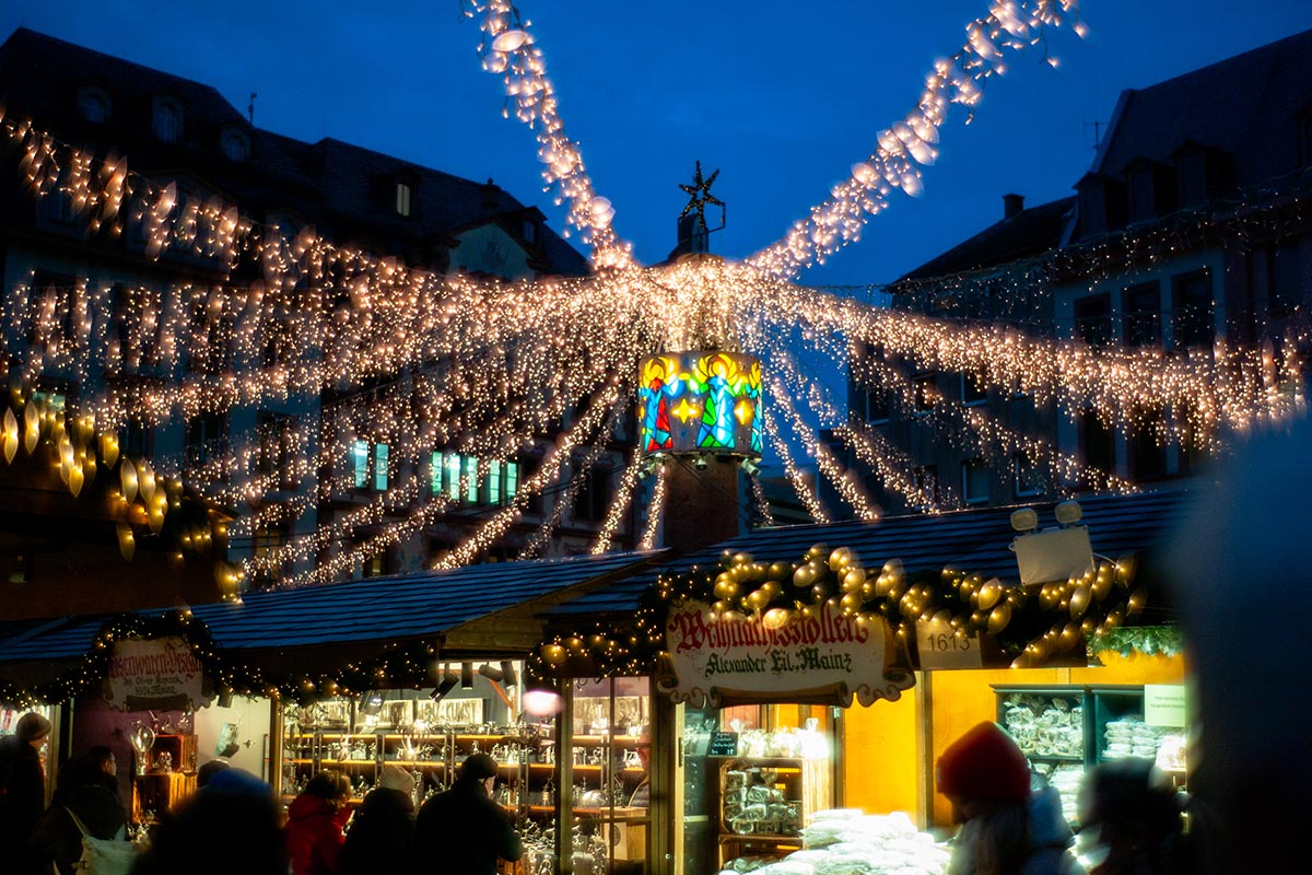 The illuminated hanging lights, shaped like glowing stars or lanterns, create a magical ambiance in the evenings, making the market feel warm and inviting. Stalls offer a mix of traditional foods, handcrafted gifts, and regional specialties, giving visitors a taste of Mainz’s local culture.