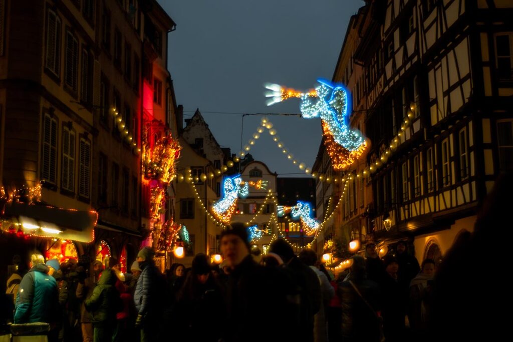 First, the river banks, bridges, and charming half timbered houses come into view, signaling that you’ve entered the historic core of the city. From there, the atmosphere becomes noticeably more festive, with Christmas lights strung across streets, decorated shopfronts, and the smell of mulled wine in the air. Rather than being concentrated in one square, the Christmas spirit in Strasbourg is spread throughout the Old Town, making the entire area feel immersive without being overwhelming.